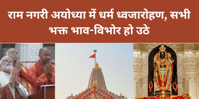 राम नगरी अयोध्या में आज धर्म ध्वजारोहण कार्यक्रम संपन्न हो गया। रामलला की प्राण प्रतिष्ठा के 673 दिन बाद आज प्रधानमंत्री नरेंद्र मोदी ने राम मंदिर के शिखर पर धर्मध्वज का आरोहण किया। इस मौके पर पीएम मोदी, मोहन भागवत, और राज्यपाल आनंदीबेन पटेल की उपस्थिति में धर्म ध्वजारोहण कार्यक्रम संपन्न हुआ । जो मंदिर का निर्माण पूरा होने का प्रतीक है।